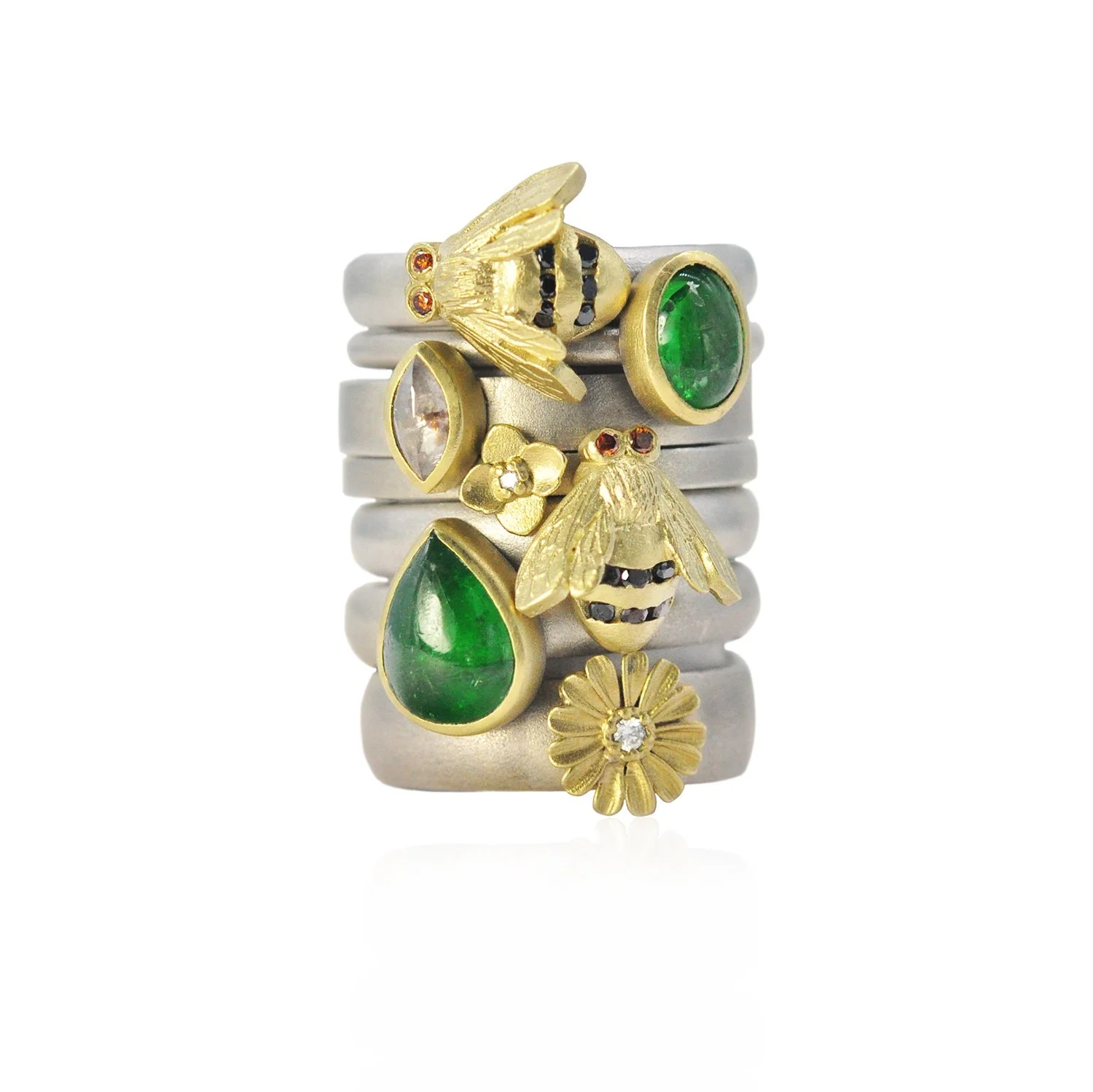 Vibrant tsavorite gems, busy bees, blooming gold flowers, and sparkling diamonds twine together in this gorgeous ring stack from our botanical jewelry collection!